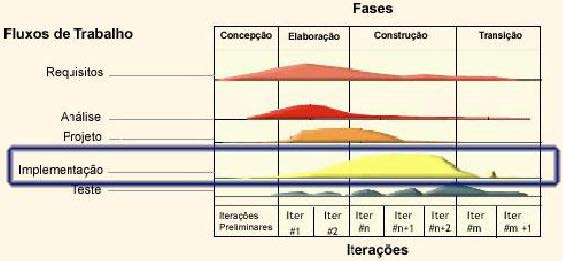 Como pode ser visto na figura a cima o Fluxo de Implementação tem maior importância durante a Fase de Construção, este Fluxo é mais simples de ser realizado devido ao fato das decisões mais difíceis terem sido tomadas durante o Fluxo de Projeto. Por isso o código gerado durante a implementação, deve ser uma simples tradução das decisões de projeto em uma linguagem especifica.