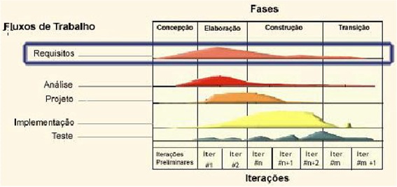Estas Fases por sua vez são subdivididas em Iterações e estas passam por cinco Fluxos de trabalho: Requisitos, Análise, Projeto, Implementação e Teste. A figura a seguir mostra um gráfico deste fluxo.