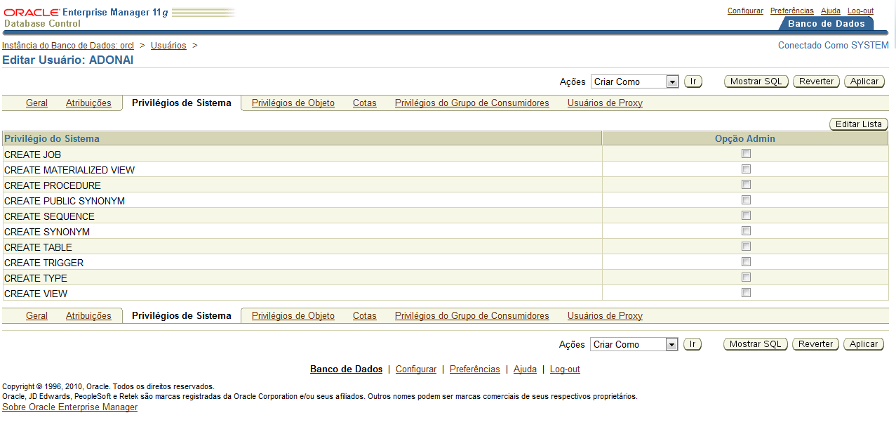 Na opção “Privilégios de Sistema” você precisa dar a permissão para o usuário fazer a criação das tabelas, triggers e outros objetos que ele vai precisar utilizar, na figura a seguir tem a lista das atribuições que eu concedi ao usuário.