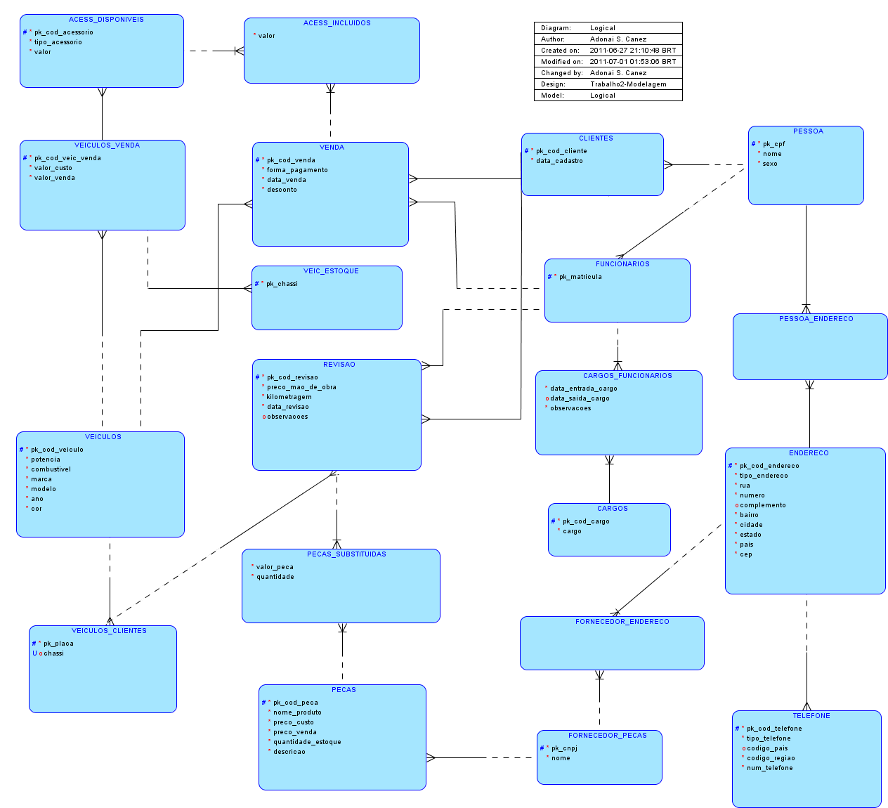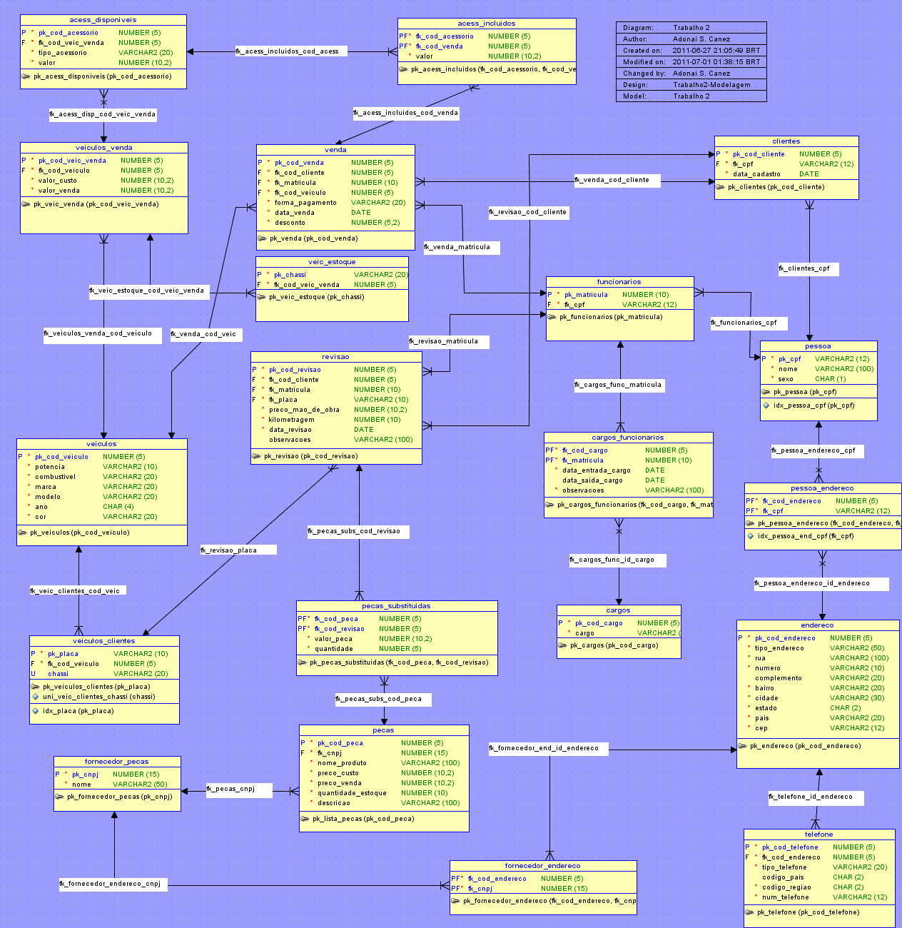 A proposta do trabalho e desenvolver a modelagem de dados para um software de revenda de automóveis que permita cadastrar os clientes, funcionários, veículos disponíveis para venda, veículos que estão em estoque, as vendas de veículos realizadas, as revisões de veiculos juntamente com as peças substituídas e armazenar a lista de peças para substituição e os respectivos fornecedores.