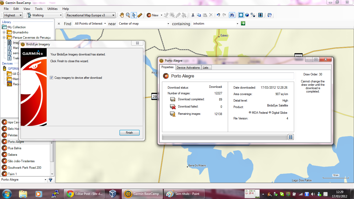 Ao final do download o tamanho total das imagens foi de 146 MB, bem inferior ao que tinha sido informado. Nos meus primeiros testes logo que comprei o GPS, após baixar uma imagem grande como essa o software não me permitia baixar mais nenhuma imagem, avisava que eu tinha excedido o limite de download, mas nos testes que realizei agora isso não aconteceu, então uma das minhas reclamações contra o BirdEyes pode ter sido solucionada.