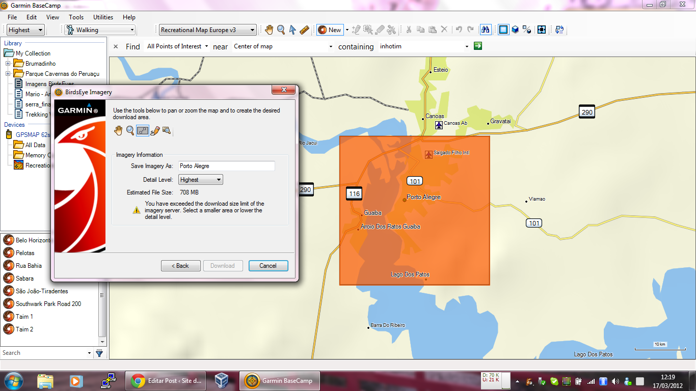 Outra reclamação que tenho com relação ao serviço é que a Garmin diz que não existe limite de download para as imagens, mas isso é mentira. E o que é pior, eles contabilizam o tamanho da imagem de forma errada o que acaba prejudicando o usuário. Por exemplo: o software permite selecionar 3 níveis de qualidade para baixar as imagens: Standard, High e Highest sendo que a diferença de tamanho do formato Standard para o Highest é enorme, tipo no meu exemplo vou selecionar a imagem de Porto Alegre/RS no formato Standard a imagem foi com 8 MB, no High fica com 250 MB e no Highest com 708 MB, sendo que desse tamanho o software já não me permite mais baixar a imagem, como pode-se ver na imagem abaixo.