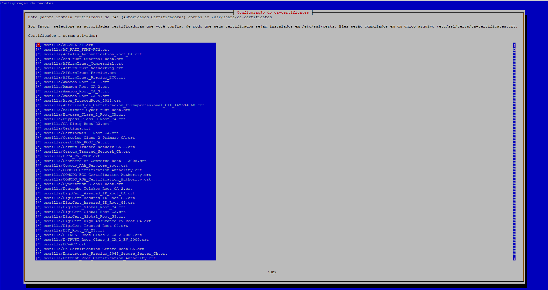 “Este pacote instala certificados de CAs (Autoridades Certificadoras) comuns em /usr/share/ca-certificates. Por favor, selecione as autoridades certificadoras que você confia, de modo que seus certificados sejam instalados em /etc/ssl/certs. Eles serão compilados em um único arquivo /etc/ssl/certs/ca-certificates.crt.”